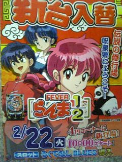 リアホの一つ、大型パチ店舗に行ったらば、ワタクシの生涯で初めて出会った作品、らんま1/2が導入されておりました。(写真参照)